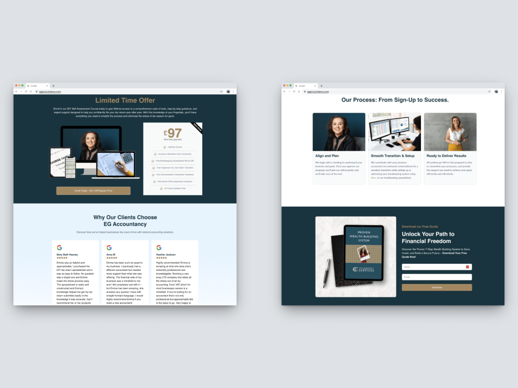 To lay a strong foundation for the project, we worked closely with the EG Accountancy team to gain a deep understanding of their services, clientele, and key goals for the site. We conducted market research to understand current industry trends and user expectations, and also analysed local competitors to identify opportunities for differentiation. This phase helped us define a clear strategic direction for the website content and structure.